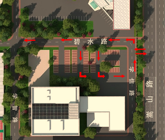 二、2025年5月30日6时起西大直街复华街校门车辆出口试运行。主楼前临西大直街道路设置为校园公交专用通道,其他车辆从主楼门前道路通行,主楼西侧门洞道路为自南向北单行道路,主楼东侧门洞道路为自北向南单行道路(如图2)。同时,开通西大直街复华街人行通道。