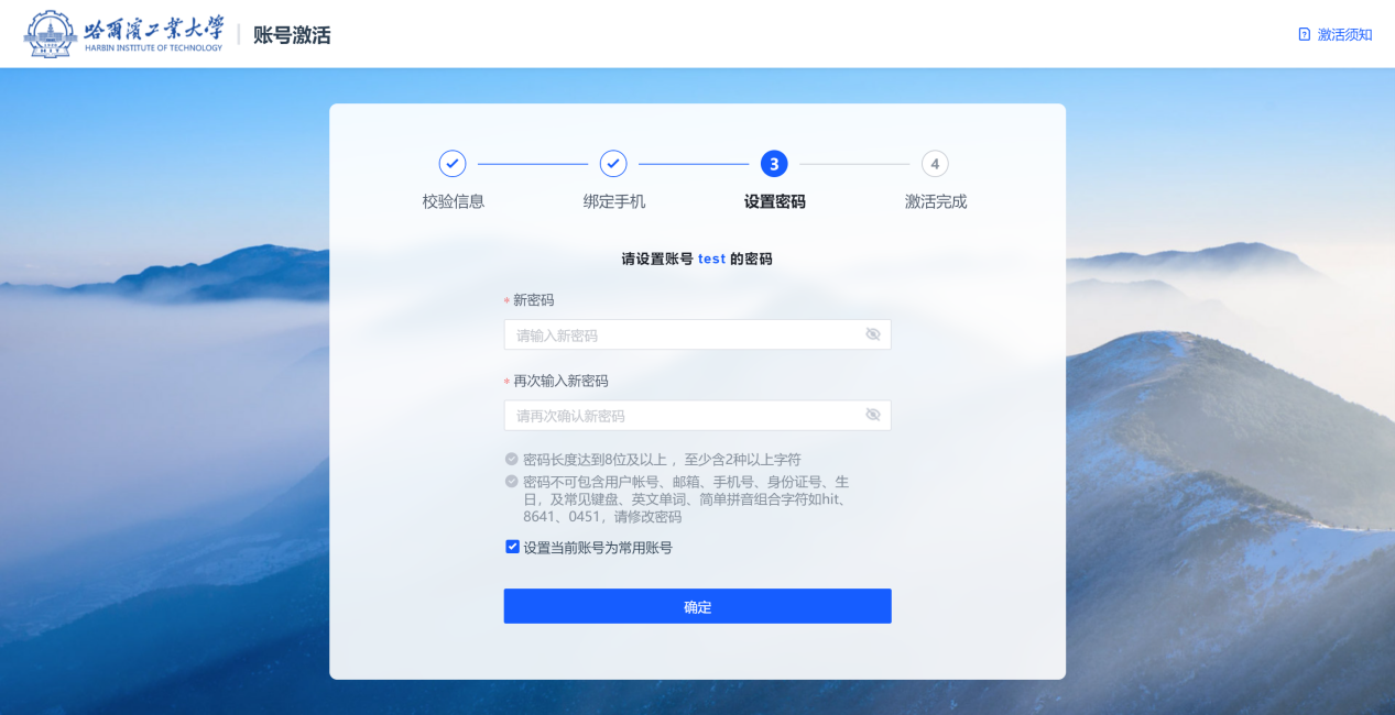 第三步,设置密码:输入新密码和再次确认新密码,按提示注意密码强度,点击【确定】激活完成。