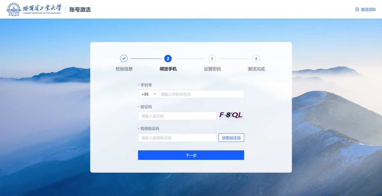 第二步,绑定手机:输入正确手机号、验证码、短信验证码,点击【下一步】。