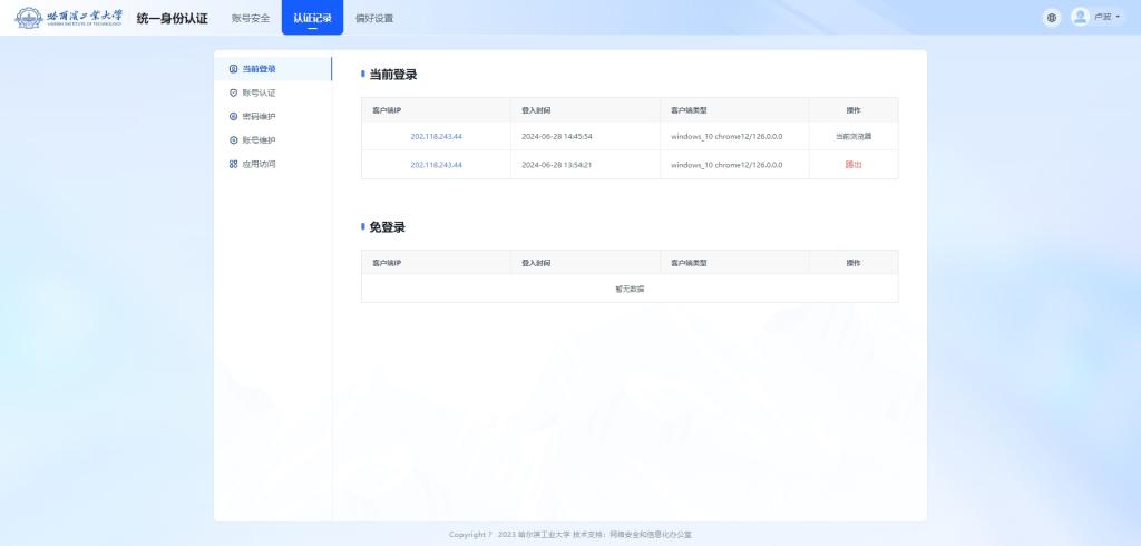 登录https://ids.hit.edu.cn,选择【认证记录】菜单,选择【当前登录】、【账号认证】、【密码维护】、【账号维护】、【应用访问】功能查看用户相关操作日志。