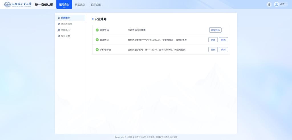 登录https://ids.hit.edu.cn,选择【账号安全】菜单~【设置账号】功能,点击【更换密码】修改密码,点击【绑定】更换手机号或邮箱绑定。点击【解绑】清空手机号或邮箱绑定。