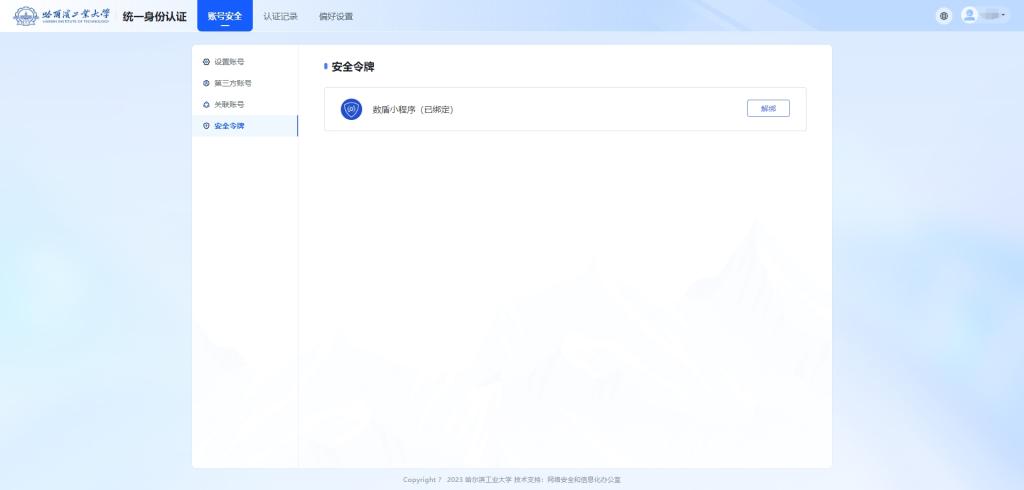 登录https://ids.hit.edu.cn,选择【账号安全】菜单~【安全令牌】功能,【立即绑定】或【解绑】数盾OTP微信小程序。