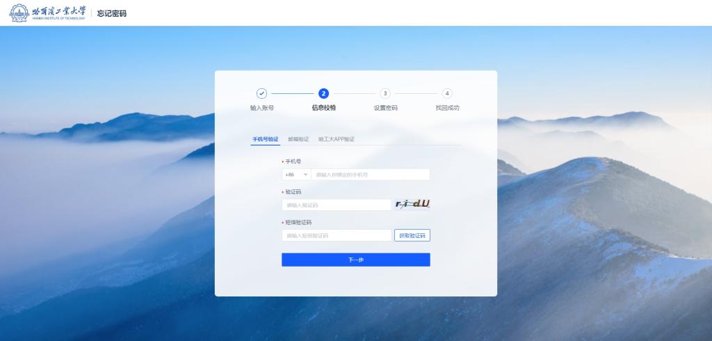 第二步,安全验证:找回密码我们支持三种方式,手机号验证、邮箱验证、哈工大APP验证。根据自己的实际情况选择,点击【下一步】。