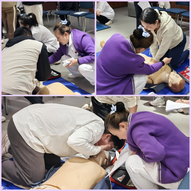 本次培训分为“实操讲解➕演练考核”相结合模式,时珊珊讲师用幽默风趣的语言和严谨专业的知识,深入浅出地讲解了心肺复苏(CPR)的重要性、自动体外除颤器(AED)的使用方法、气道异物梗阻的急救(海姆立克急救法)操作流程,现场与学生们频频互动,让原本枯燥的理论知识变得生动易懂。